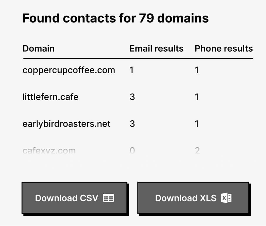 The approved websites are scanned for emails, phone numbers, and linked social profiles. Results are grouped by domain and available for download as CSV or XLS files.