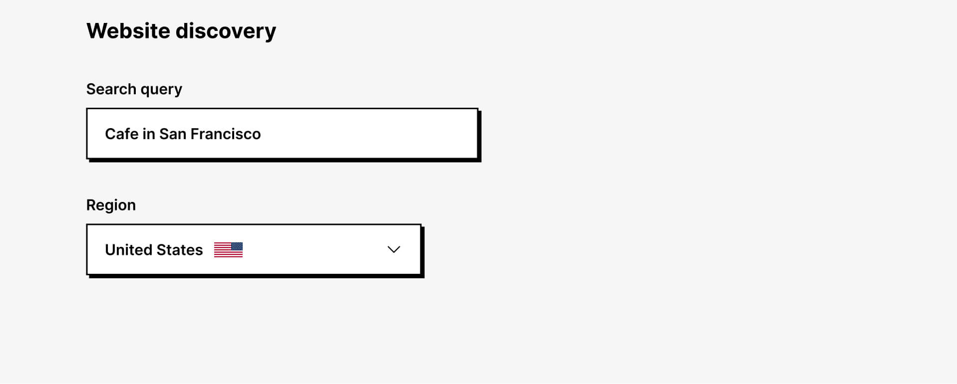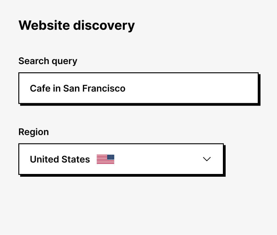 Enter a search query and choose a region. We run Google search for it and display deduplicated candidate domains for your review.