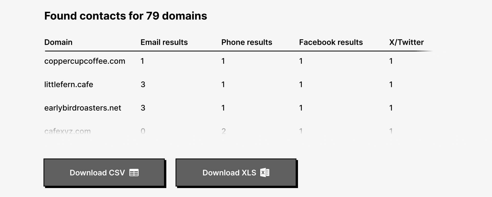 The approved websites are scanned for emails, phone numbers, and linked social profiles. Results are grouped by domain and available for download as CSV or XLS files.